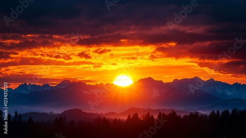 © Arthur Constantine, Fototapeta premium Fiery Sunset over Silhouetted Mountains