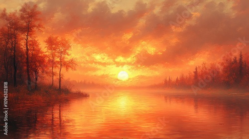 Fototapeta premium Fiery Sunset over Tranquil Lake