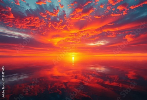 Fototapeta premium Fiery sunset paints desert sky, reflecting on calm ocean water, sky, arid
