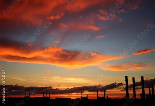 Fototapeta premium Fiery sunset paints dramatic clouds above silhouetted industrial smokestacks,...