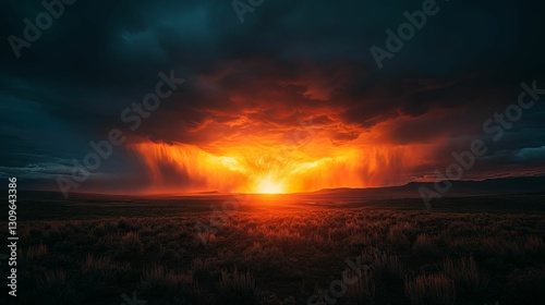© jago, Obraz premium Fiery Sunset Rain Dramatic Landscape Scene