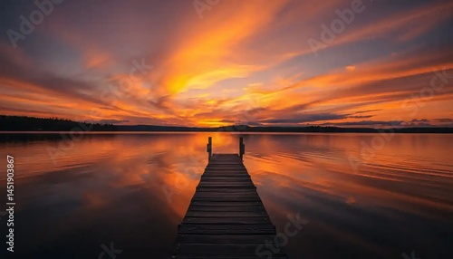 © Rijal, Naklejka premium Fiery Sunset Reflected on Secluded Lake with Wooden Dock