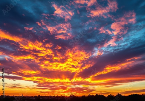Fototapeta premium Fiery Sunset Sky: A breathtaking, vibrant sunset paints the sky with streaks...