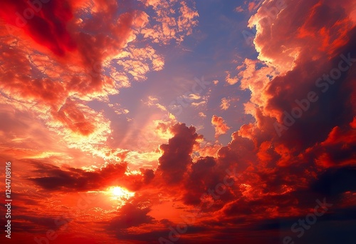 Naklejka premium Fiery Sunset Sky Dramatic Red Clouds, Burning Orange Hues, Golden Sun