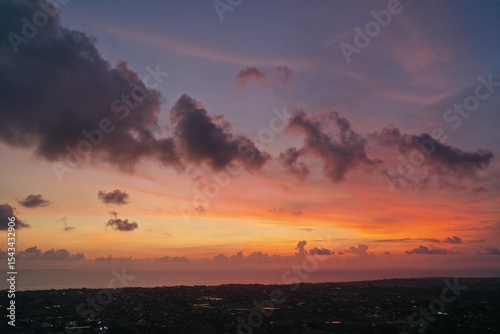 Fototapeta premium Fiery Sunset Sky Over Canggu — Aerial Drone View, Bali