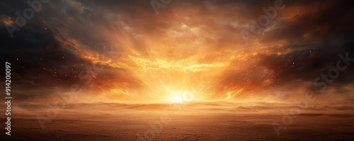 Naklejka premium Fiery sunset sky with golden clouds and a bright horizon.