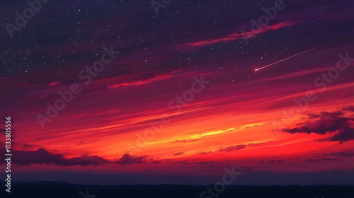 © sungedi, Fototapeta premium Fiery Sunset Sky With Shooting Star And Distant Hills