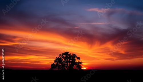 Fototapeta premium Fiery Sunset With Silhouetted Tree Against Vivid Orange and Blue Sky in a Low...
