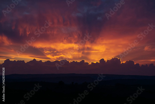 © RF GRAPHIC, Fototapeta premium Fiery Sunset with Sun Rays Breaking Through Clouds Over Silhouetted Landscape dramatic