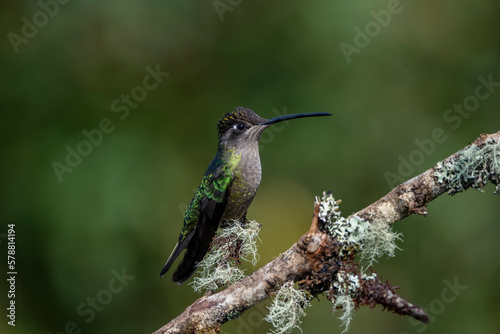 © mylasa, Obraz premium Fiery-throated hummingbird on mossy tree branch , watercolor artistic work .