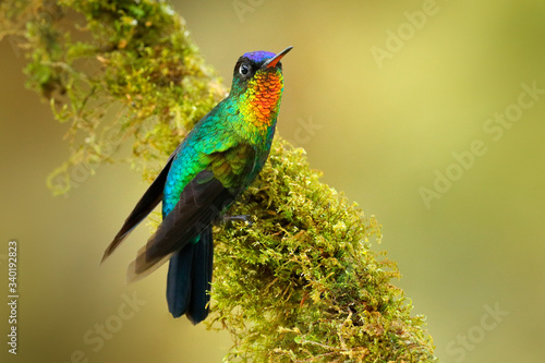 © ondrejprosicky, Fototapeta premium Fiery-throated Hummingbird, Panterpe insignis, colorful bird sitting on mossy branch. Mountain bright animal from Panama. Detail portrait of shiny bird.