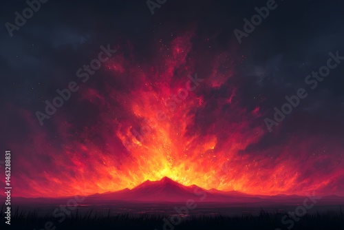 © sakib, Fototapeta premium Fiery Volcanic Eruption at Night Dramatic Landscape Painting