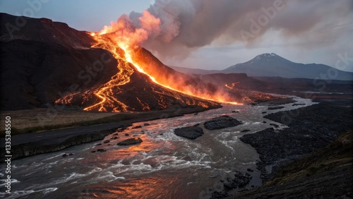 Fototapeta premium Fiery Volcano Erupting Lava Flows into River, a powerful display of nature's...