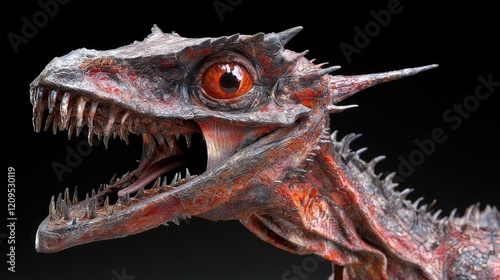 © PACESTOCK, Obraz premium Fiery young dinosaur close-up, dark background, fantasy creature
