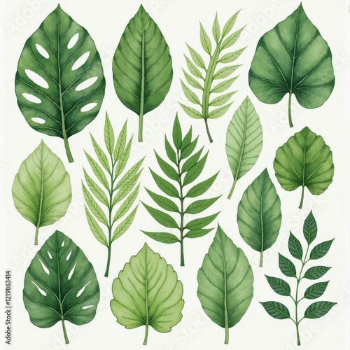 © NgoHong, Fototapeta premium Fifteen varied green leaves on white background