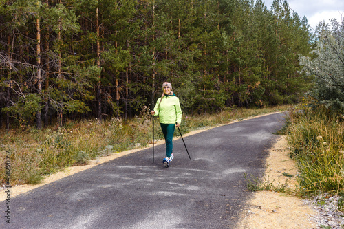 Fototapeta premium fifty-year-old woman walks down the road with sticks