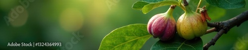 © Sathaporn, Fototapeta premium Fig on a tree branch with dew-covered leaves and fallen flowers, botanical, foliage