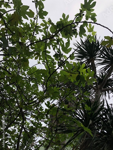 © Citra, Fototapeta premium Fig tree branches with green leaves and figs against cloudy sky