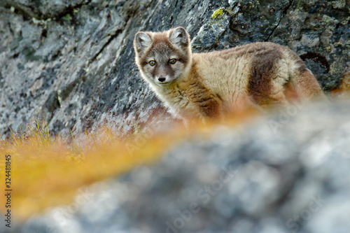 © ondrejprosicky, Obraz premium Fight of cute little Arctic Foxes, Vulpes lagopus, in the nature rocky habitat, Svalbard, Norway. Action wildlife scene from Europe.