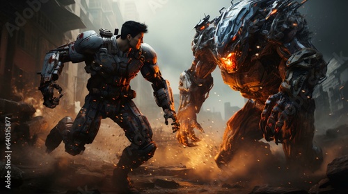© Aliaksandra, Fototapeta premium Fight of two futuristic robots with metal details