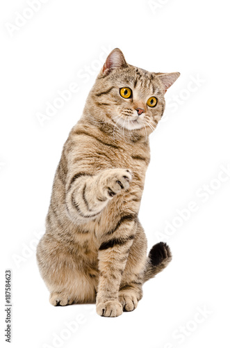 © sonsedskaya, Fototapeta premium Figlarny kot Scottish Straight, siedzący z podniesioną łapą, na białym tle na białym tle