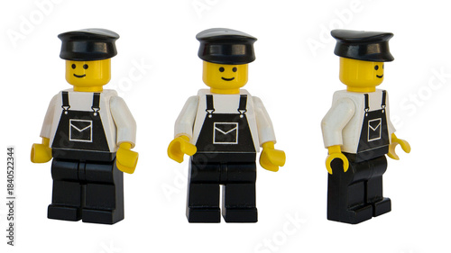 © Bittbrew, Fototapeta premium Figura de hombre cartero de LEGO oficial. Tres posturas. Imagen aislada