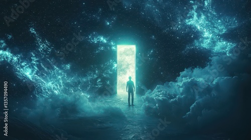 © Image Tree, Fototapeta premium Figure before a surreal luminous doorway in a dreamlike celestial landscape, standing at the threshold of the unknown.