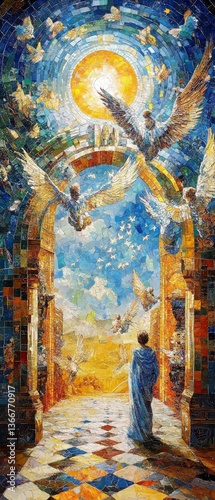 © Murda, Fototapeta premium Figure gazes toward angelic beings sun portal.