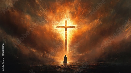 Naklejka premium Figure Underneath a Glowing Cross Silhouette