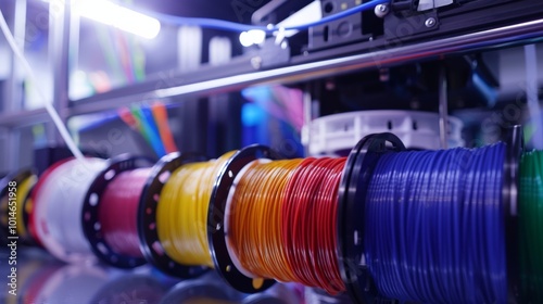 Obraz premium Filament spools for 3D printing, lined up in rich colors, highlight modern manufacturing in a high-tech setting with a focus on precision.