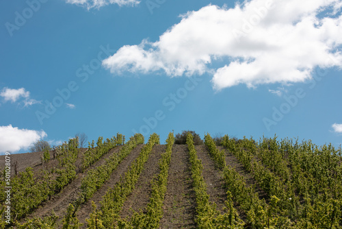 © enrico, Fototapeta premium filari di alberi da frutto sulla collina con cielo sullo sfondi