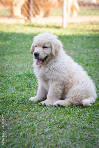 © Leandro, Fototapeta premium Filhote de Golden retriever correndo em gramado verde