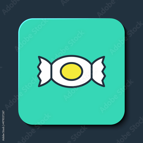 © Iryna, Obraz premium Filled outline Candy icon isolated on blue background. Happy Halloween party. Turquoise square button. Vector