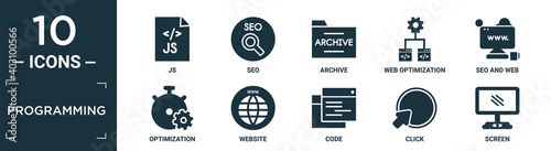 Obraz premium filled programming icon set. contain flat js, seo, archive, web optimization, seo and web, optimization, website, code, click, screen icons in editable format..