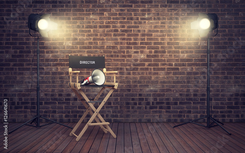 © rottenman, Fototapeta premium Film director's chair with megaphone and spotlights. 3D renderin
