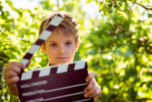 Naklejka premium Film is shot, Filming of children's film, Cartoons for children. Take pictures of children's portraits. Casting children for a role in the cinema. Boy with a cracker