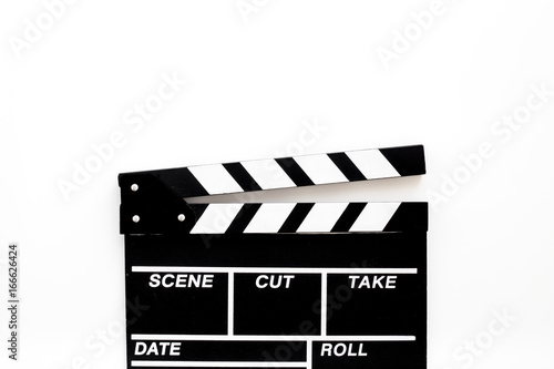 Fototapeta premium Filmmaker accessories. Clapperboard on white background top view copyspace