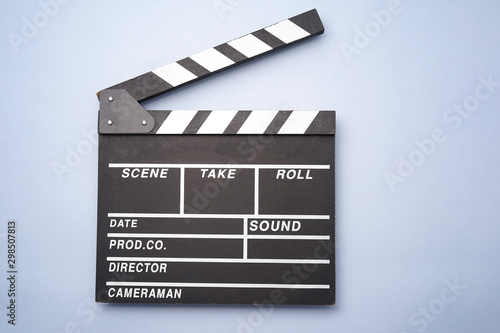 © MuhammadSyafiq, Obraz premium Filmmaker profession. Clapperboard on blue background top view copyspace