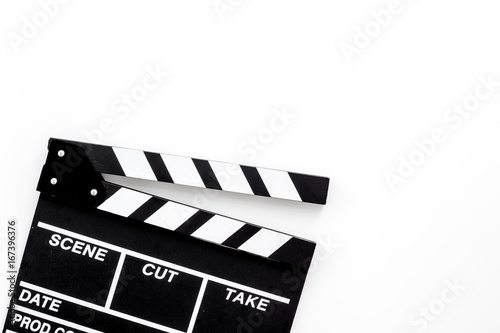 Fototapeta premium Filmmaker profession. Clapperboard on white background top view copyspace