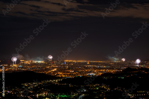Fototapeta premium Final of the festival of La Mercè 2020 with fireworks distributed throughout the city of Barcelona in order not to generate crowds of people to avoid COVID-19.