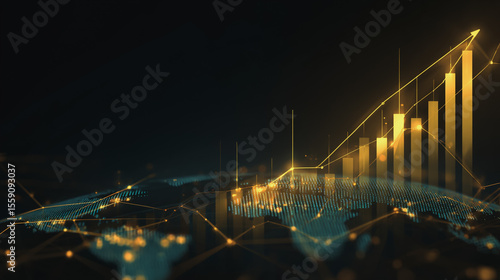 © banlai, Obraz premium finance Abstract black background uptrend arrow with candlesticks and bar chart show innovation of economy business statistics with Earth network with glowing nodes and triangle polygon linesIt
