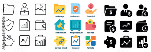 Fototapeta premium Finance and business icon collection: silhouette, linear and flat styles for investment