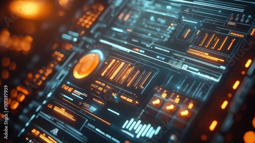 © Anchanar, Obraz premium Finance disrupt and loans concept. Futuristic digital interface with glowing elements and data visualization