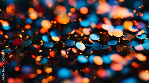 Naklejka premium Financial Abundance Close-Up of Vividly Colored Coins, Softly Defocused,...