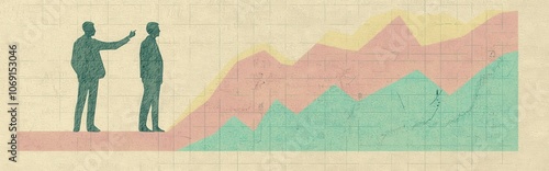 © PixelFocus, Obraz premium Financial Analysis with Graphs and Silhouettes. An illustration of two businessmen observing a rising chart, symbolizing economic insights and growth.