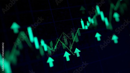 Fototapeta premium Financial candlestick chart with green upward arrows showing stock market performance,