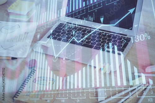 Obraz premium Financial chart drawing and table with computer on background. Multi...