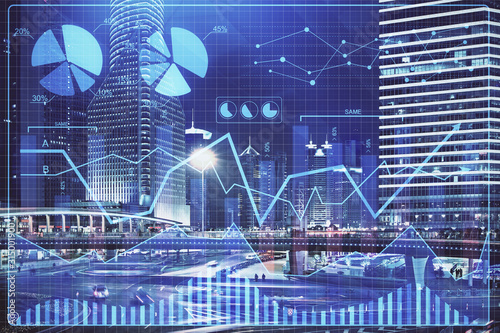 Obraz premium Financial chart on city scape with tall buildings background multi exposure....