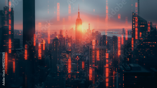 Fototapeta premium Financial charts overlaying city skyscrapers, illustrating real estate and...