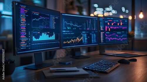 © Lensora, Fototapeta premium Financial Data Analysis on Multiple Monitors